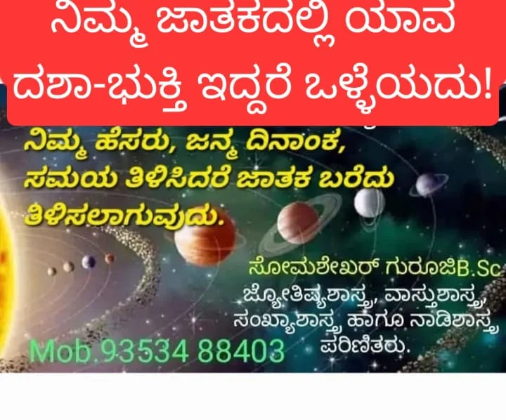 ಜನ್ಮ ದಿನಾಂಕ ಸಮಯ ತಿಳಿಸಿದರೆ ಜಾತಕ ಬರೆದು ನಿಮ್ಮ ಸಮಸ್ಯೆಗಳ ಬಗ್ಗೆ ಮಾಹಿತಿ ನೀಡಲಾಗುವುದು,